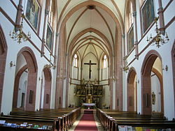Das kreuzrippengewölbte Mittelschiff hat eine zweigeschoßige Aufrissgliederung ohne Triforium. Die Vierung mit abgefasten Spitzbögen liegt um einen Meter höher als das Mittelschiff. Das Querschiff hat dieselbe Höhe wie das Mittelschiff. Die Seitenschiffe sind zum Mittelschiff und zu den Querschiffen mit Spitzbogenarkaden geöffnet. Der eingezogene Chor ist um drei Stufen erhöht. An der Chornordseite befindet sich die Johanneskapelle mit einem Kreuzrippengewölbe. Die sechs großen Wandgemälde über den Stichbogenarkaden im Langhaus zeigen Szenen aus der Kindheit Jesu und wurden 1895 von Emanuel Walch in Stile der Nazarener gemalt.