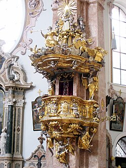 - Kanzel und Orgelprospekt der Stadtpfarrkirche, heute Dom zu St. Jakob, Innsbruck, 1723–1725[4]