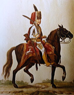 | Lucknerscher Husar im Siebenjährigen Krieg. | Joachim Niemeyer/Georg Ortenburg (Hg.): Die Chur-braunschweig-lüneburgische Armee im Siebenjährigen Kriege: Das "Gmundener Prachtwerk"; Beckum 1976 | wahrscheinlich Carstens | Datei:Kurhannoversches Husarenregiment Luckner 1761.JPG | |