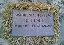 | Gedächtnistafel für Nina Schenk Gräfin von Stauffenberg, Justizvollzugsanstalt Rottweil, Deutschland | Eigenes Werk | Okmijnuhb | Datei:D-RW-JVARottweil - Gedenktafel Graefin v. Stauffenberg.jpg | |