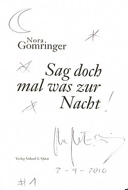 | Nora Gomringer: Sag doch mal was zur Nacht , 2006, Unterschrift 2. September 2010 | Nora Gomringer: Sag doch mal was zur Nacht , 2006, Titelblatt mit Unterschrift 2. September 2010 | Nora Gomringer | Datei:Nora Gomringer Signatur 2010.jpg | |