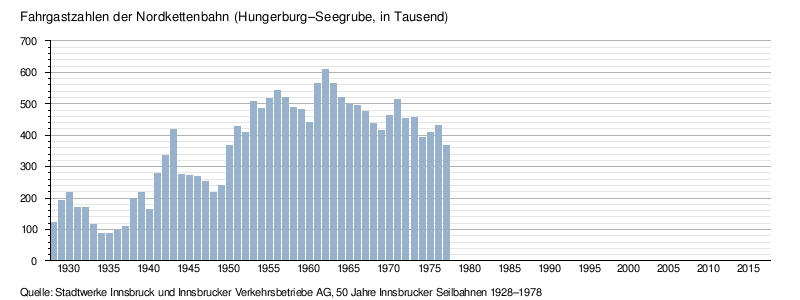 In den Jahren 1929–1932 wurden 297.028 Fahrgäste befördert und ein Gewinn von 204.481 Schilling erwirtschaftet.[2] Im Jahr 1937 wurde eine Zusteigstelle bei Stütze 3 errichtet.[3][4] Diese wurde bis 1966 betrieben und nach einer Zerstörung durch Lawinen aufgelassen.[5] 1940 übernahmen die Innsbrucker Stadtwerke die Bahn. 1945 wurden durch die Jenbacher Werke neue Kabinen geliefert.[5][6] In den 1950er Jahren kam es zu einem mehrmaligen Umbau der Bahn, um die Beförderungsleistung anzuheben, darunter ein Generalumbau der Bahn 1958–1960.[5] 1979 übernahmen die Innsbrucker Verkehrsbetriebe die Nordkettenbahn.[5] 1996 übernahmen die Zeller Bergbahnen die Nordkettenbahn, die jedoch nach Differenzen über Maßnahmen zur Attraktivitätssteigerung von der Stadt Innsbruck zurückgekauft wurde. Die mit der Zeit veralteten technischen Anlagen führten über einen längeren Zeitraum zu Plänen über einen Umbau oder Neubau der Bahn.