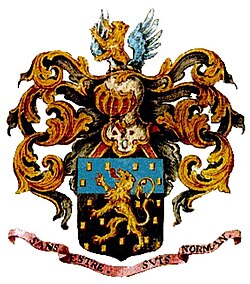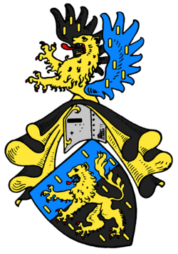 Stammwappen: Schwarz mit blauem Schildhaupt, das Ganze belegt mit einem goldenen Löwen und bestreut mit goldenen Schindeln. Auf dem Helm mit schwarz-goldenen Decken der Löwe wachsend zwischen mit goldenen Schindeln bestreutem, rechts schwarzen, links blauem Flug (der Flug kommt in einigen Darstellungen auch ganz blau vor).