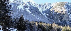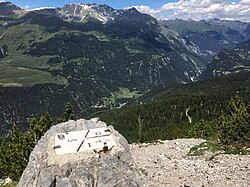 | Blick vom Dreiländerpunkt A - IT - CH auf das untere Unterengadin bei Valsot , ziemlich im Osten der Schweiz . Unten der Fluss in der Schlucht bei Martina ist der En, bzw. der Inn etwas oberhalb von Finstermünz. Auf der Schweizer Seite des Tals über den Felsen sind einige Almen zu sehen, darüber die Berggipfel um den Piz Mundin, näher zum Inn hin der vorspringende Gipfel des Piz Alpetta mit dem Seitental Val da Tschera dahinter. Auf der diesseitigen Talseite sind ganz am Bildrand oberhalb der Schlucht die kleineren Höhen der Schöpfwarte ansteigend zu den Sellesköpfen und die Norbertshöhe und die Passstrasse bei → Nauders zu erahnen. | Eigenes Werk | Taktaal | Datei:Dreiländerpunkt A-IT-CH.jpg | |