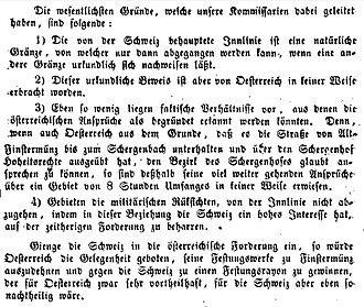 | Schweizer Argumentation bzgl. des Novellaberg-Konfliktes vom Dezember 1859, veröffentlicht 1860. „Die wesentlichsten Gründe, welche unsere Kommissarien dabei geleitet haben, sind folgende : 1) Die von der Schweiz behauptete Innlinie ist eine natürliche Gränze, von welcher nur dann abgegangen werden kann, wenn eine andere Gränze urkundlich sich nachweisen läßt. 2) Dieser urkundliche Beweis ist aber von Oesterreich in keiner Weise erbracht worden. 3) Eben so wenig liegen faktische Verhältnisse vor, aus denen die österreichischen Ansprüche als begründet erkannt werden könnten. Denn, wenn auch Oesterreich aus dem Grunde, daß es die Straße von Alt-Finstermünz bis zum Schergenbach unterhalten und über den Schergenhof Hoheitsrechte ausgeübt hat, den Bezirk des Schergenhofes glaubt ansprechen zu können, so sind deßhalb seine viel weiter gehenden Ansprüche über ein Gebiet von 8 Stunden Umfanges in keiner Weise erwiesen. 4) Gebieten die militärischen Rüksichten, von der Innlinie nicht abzugehen, indem in dieser Beziehung die Schweiz ein hohes Interesse hat, auf der zeitherigen Forderung zu beharren. Gienge die Schweiz in die österreichische Forderung ein, so würde Oesterreich die Gelegenheit geboten, seine Festungswerke zu Finstermünz auszudehnen und gegen die Schweiz zu einem Festungsrayon zu gewinnen, der für Oesterreich zwar sehr vortheilhaft, für die Schweiz aber eben so nachtheilig wäre.“ | Eigenes Werk | Panda17 | Datei:SwissArgumentsNovellaberg1859.jpg | |