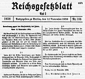 Bereits am 10. November hatte Hitler nach Görings Aussage ihm und Goebbels befohlen, die Juden nun vollends aus der deutschen Wirtschaft auszuschließen. Wie dies geschehen könne, diskutierten die Anwesenden am 12. November 1938. Ein Ergebnis war die Verordnung zur Ausschaltung der Juden aus dem deutschen Wirtschaftsleben, die Göring am selben Tag erließ: Danach sollten alle reichsdeutschen Juden weitgehend enteignet, aus dem Kulturleben entfernt, aus dem Blickfeld der Öffentlichkeit verbannt und zur Auswanderung gezwungen werden. Das erklärte Ziel war, das Deutsche Reich „judenfrei“ zu machen. Die Bestandsaufnahme zeigte, dass ein Großteil der zerstörten „jüdischen“ Geschäftsräume und Wohnungen „Ariern“ gehörte und von Juden nur gemietet war; die Versicherungsgesellschaften mussten diese Schäden ersetzen. Allein der Glasbruch kostete annähernd drei Millionen, die gesamten Versicherungsschäden wurden auf 225 Millionen Reichsmark beziffert.[63]