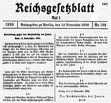 - ↑ Göring, Seyß-Inquart: 585. Kundmachung des Reichsstatthalters in Österreich, wodurch die Verordnung zur Wiederherstellung des Straßenbildes bei jüdischen Gewerbebetrieben vom 12. November 1938 bekanntgemacht wird. In: Gesetzblatt für das Land Österreich. Nr. 165, 19. November 1938 (alex.onb.ac.at [abgerufen am 26. Februar 2015] „Diese Verordnung, die im Reichsgesetzblatt unter I S. 1581 verlautbart ist, ist im Lande Österreich am 15. November 1938 in Kraft getreten.“).