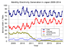 | Source is Japan's FEPC . (English) Created in Gnumeric. | Eigenes Werk | Theanphibian | Datei:Japan monthly electric generation 2009 to 2014.svg |