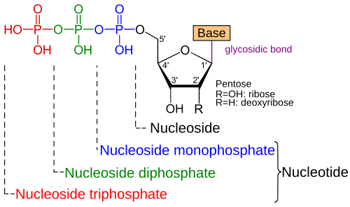 Bei einem Nukleotid ist die 5'-OH-Gruppe der Pentose eines Nukleosids mit einem Phosphatrest verestert. Ein Nukleosidtriphosphat (NTP) weist drei Phosphatgruppen auf, die untereinander Säureanhydridbindungen ausbilden. Mit Adenin als Base und Ribose als Saccharid liegt das Adenosintriphosphat (ATP) vor.