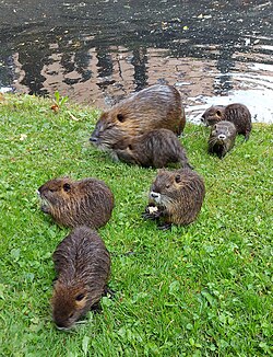Nutria Muttertier mit jungen Nutrias am Schlossgraben in Celle | Eigenes Werk | Photographer and uploader was Hajotthu at de.wikipedia | Datei:Myocastor coypus (juvenile) 20220829 (3).jpg | |