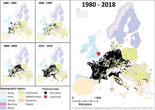 - ↑ Liste invasiver gebietsfremder Arten von unionsweiter Bedeutung (List of Invasive Alien Species of Union Concern) (PDF) abgerufen am 15. Juli 2016