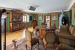 | OÖ. Sensenschmiedemuseum in Micheldorf, Blumauerzimmer. Die Einrichtung mit Barock- und Empiremöbeln, der Sitzgarnitur mit dem reich intarsiertem Kastentisch, den Familienportraits von F. X. Bobleter und der Biedermeiertapete bildet ein organisch gewachsenes Interieur, das aus dem „Schönen Zimmer“ im Herrenhaus des Sensenwerks Blumau stammt. | Eigenes Werk | Martin Osen | Datei:OÖ. Sensenschmiedemuseum, Herrenhaus, Blumauerzimmer.jpg | |