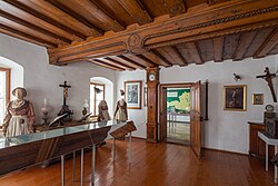 | OÖ. Sensenschmiedemuseum in Micheldorf, Zunftzimmer. Reich geschnitzte barocke Balkendecke, deren Rüstbaum mit 1706 datiert ist und das Markenzeichen „Kelch mit Hostie“ sowie die Initialen „G G“ (für Georg Grätt) trägt. | Eigenes Werk | Martin Osen | Datei:OÖ. Sensenschmiedemuseum, Herrenhaus, Zunftzimmer.jpg |