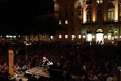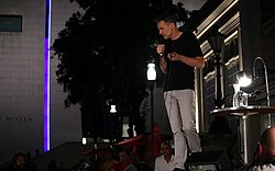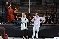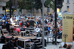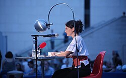 | Eröffnung des Literaturfestivals o-töne 2015 durch Gabriela Hegedüs und Christoph Möderndorfer , auf der Bühne Schmieds Puls ; Haupthof des MuseumsQuartiers in Wien , Österreich . | Eigenes Werk | Manfred Werner ( Tsui ) | Datei:O-töne 2015 opening 04 Gabriela Hegedüs Christoph Möderndorfer Schmieds Puls.jpg |