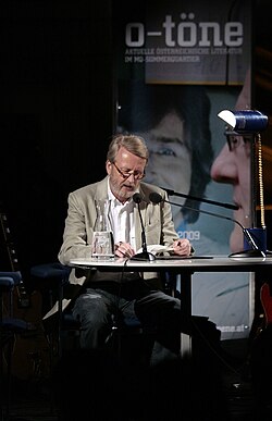 | Der Schriftsteller Gernot Wolfgruber ; Lesung während des Literaturfestivals O-Töne im MuseumsQuartier in Wien . | Eigenes Werk | Manfred Werner - Tsui | Datei:Gernot Wolfgruber, o-töne 2009 b.jpg | |