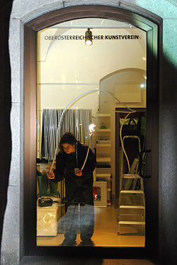 | eine raumeinpflegung (installation in progress) vonelffriede.aufzeichnensysteme* | Oberösterreichischer Kunstverein | Oberösterreichscher Kunstverein, Ingrid Hahn (Galerieleitung) | Datei:Ooekv elffriede schaufenster2012.jpg | |