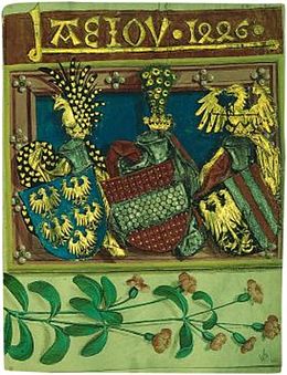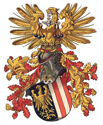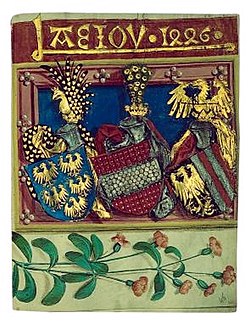| Das Fünfadlerwappen der Babenbergischen Marcha orientalis, genannt Altösterreich , später Lerchenwappen , heute Wappen des Bundeslandes Niederösterreich . Abgebildet im Babenberger Stammbaum um 1490, dem Markgrafen Adalbert dem Siegreichen (um 985–1055) zugeschrieben – ob er das Wappen in dieser Form wirklich geführt hat, ist unbekannt. | self-made, Image:Niederösterreich CoA.svg adapted to Image:Adalbert der Siegreiche.jpg | W!B: | Datei:Altösterreich Adalbert Babenberger Stammbaum.svg | |
