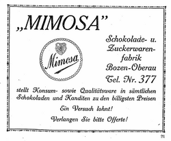 | Advertisements for Chocolate fabric in Oberau-Bozen in South Tyrol's Telephone directory from 1925 (Bozen-Bolzano) | South Tyrol's Telephone directory from 1925 (Bozen-Bolzano) | Autor/-in unbekannt Unknown author | Datei:Schokoladefabrik Oberau Bozen 1925.png |