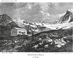 | Karlsbader-Hütte aus Zeitschrift des Deutschen und Oesterreichischen Alpenvereins 1894 Band 25 | austrian literature online | Edward Theodore Compton | Datei:Karlsbader-Hütte 1894.jpg | |