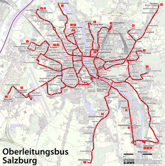 Derzeit verkehren die zwölf Salzburger Obus-Linien wie folgt, einige Linien überqueren dabei die Stadtgrenze Salzburgs: