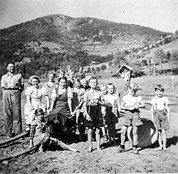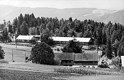 Die Bauern, im Nationalsozialismus als Reichsnährstand bezeichnet, waren streng hierarchisch organisiert und wurden gefördert, um das Deutsche Reich möglichst unabhängig vom Ausland zu machen. Grundsätzlich herrschte Arbeitszwang und die freie Berufswahl war weitgehend eingeschränkt. Junge Männer und Frauen wurden für ein halbes Jahr zum unbezahlten Reichsarbeitsdienst (RAD) eingezogen.[54] Bereits im Juni 1938 wurden Pläne für elf Reichsarbeitsdienstlager in Kärnten bekannt, wobei es anfangs um die Flussregulierungen, Trockenlegung von Mooren und den Bau von Wegen ging.[55] In Obermillstatt entstand das zwölfte Kärntner RAD Lager mit der Nummer 4/224 speziell für junge Frauen. Wer hinter der Standortwahl für das Arbeitsmaidenlager im Ort stand, ist unbekannt. Insbesondere für die nationalsozialistischen Bauern des Millstätter Berges waren die Gratisarbeitskräfte von großem wirtschaftlichen Nutzen. Als katholisch eingestufte Bauern oder Keuschlern, wo die Männer im Krieg waren, wurden bei der Zuteilung der Arbeitskräfte nicht berücksichtigt. Im RAD-Mädchenlager befanden sich durchschnittlich 40 bis 50 Frauen, die bei den Bauern in den umliegenden Dörfern landwirtschaftliche Arbeiten zu verrichten hatten. Die anstrengende Arbeit am Feld, im Stall und auf der Alm sah die NS-Propaganda naturgemäß positiv: KDF nahm die Jugend in Betreuung und verschaffte viele fröhliche und aufklärende Stunden.[56] Im Lager gab es immer wieder Feierlichkeiten z. B. am Muttertag. Bei dieser Gelegenheit verlieh der Ortsgruppenleiter Ehrenkreuze.[57] Mit dem fortschreitenden Krieg kamen Zwangsarbeiterinnen dazu. Im Laufe des Krieges wurden auch Kriegsgefangene zur Arbeit eingesetzt. An der Stelle des ehemaligen Lagers, umgangssprachlich „Bei den Baracken“ genannt, wurde 1977 die neue Volksschule von Obermillstatt errichtet.