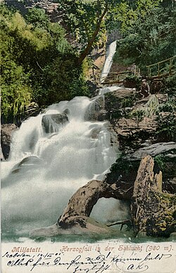 Ab den 1870er Jahren setzt der Fremdenverkehr in Millstatt ein.[22] 1884 werden erstmals die neu erbauten Villen, aber auch die traditionsreichen und gutgepflegten Bauernhöfe um Millstatt erwähnt. In Fremdenführern und Prospekten werden u. a. Wanderungen in die Dörfer auf dem Millstätter Berg und der Millstätter Alpe besonders wegen der sehr schönen Aussicht empfohlen. Ein beliebter Weg führte durch die Schlucht zum Herzog- und Rautfeldbauerfall. Beliebt war auch der „Hochweg“ zur Rainer-Hube, ein Landgasthaus, die spätere Volksschule. Vulgo Ranner[23] war einst der schönste und größte Obermillstätter Bauernhof mit über 18 ha Grund, davon alleine 5,4 ha „besten Baugrund“ (die Äcker unterm Dorf), Wiesen, Alm und Wald am Lerchriegel, entsprechende Nachbarschaftsanteile und eigener großer Mühle. Der Hof stand ab 1877 zum Verkauf.[24] Aus Haus und Hofgarten wurde die Volksschule und aus dem landwirtschaftlichen Teil der vlg Ranner (das jetziges Gemeinschaftshaus). Der Ranner wurde 1903 zwangsversteigert, da die Bauersleute jung starben[25] und niemand das Erbe der noch jungen Kinder retten wollte.