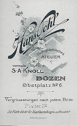 | Reverse of Pohl's Carte de visite Bozen-Bolzano | Own collection, late 19th century photograph | Photograph Pohl, Bozen (19th century) | Datei:Revers Pohl, vorm. Knoll, Bozen.jpg | |