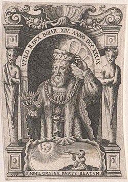 | VTILO II. DVX BOIARVM XIV. ANNO DCC XXXIX - „Odilo II., 14. Herzog der Bajuwaren, im Jahr 739“; Darstellung des 17. Jahrhunderts | Ursprung unbekannt Unknown source | Autor/-in unbekannt Unknown author | Datei:Vtilo Dvx Boiar (Odilo, † 748).jpg |