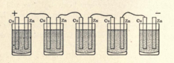 | Pila di Volta a corona di tazze | Electrochemistry, Theoretical Electrochemistry and its physico-chemical foundations - http://openlibrary.org/books/OL14006002M/Electrochemistry . | Heinrich Daneell | Datei:Pila di Volta a corona di tazze - Daneell.png |