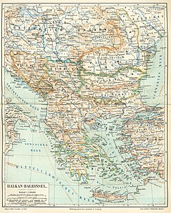 | Karte der Balkan-Halbinsel (1 : 6 000 000) | vol. 15 of the 4th edition of Meyers Konversations-Lexikon | various | Datei:Balkan-Halbinsel (Doppelseitige Farbkarte).jpg | |