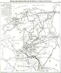 | Vormarsch der 8. Armee in Livland und Estland | Der große Krieg in Einzeldarstellungen. (Hrsg.) Generalstab des Feldheeres. Heft 39, Die Befreiung von Livland und Estland, Verlag von Gerhard Stalling, 1918 | Vermessungsabteilung Nr. 18 | Datei:Karte Livland2.jpg | |