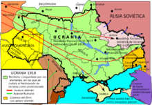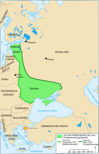 | Entwicklung der Ostfront im Ersten Weltkrieg vom Waffenstillstand am 15. Dezember 1917 bis zum de:Friedensvertrag von Brest-Litowsk am 3. März 1918. Frontlinie zur Zeit des Waffenstillstandes am 15. Dezember 1917. Von den Mittelmächten nach Wiederaufnahme der Kampfhandlungen zwischen dem 18. Februar und 3. März 1918 besetzte Gebiete. Frontlinie zur Zeit des Unterzeichnung des Friedensvertrages am 3. März 1918. | Eigenes Werk (own work), apart from minor changes based on the original Image:Carte_des_conséquences_du_Traité_de_Brest-Litovsk.svg by historicair | Furfur | Datei:Map Treaty of Brest-Litovsk-de.svg | |