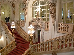 Drei Haupt- und zwei seitliche Nebeneingänge führen in das Innere des Opernhauses, zur prunkvollen, lichtdurchfluteten Eingangshalle mit der zentralen Haupttreppe sowie zwei separaten Seitenaufgängen. Die Treppenhalle gilt als Mittelpunkt, da die Haupt- wie auch die beiden Nebentreppen hier zu einer großen, repräsentativen Raumkomposition zusammengefasst sind.[20]