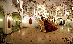 Die dekorative Haupttreppe beginnt mit einem ausladenden Mittellauf und teilt sich von einem Podest in zwei Treppenarme, die zu den umlaufenden Galerien der oberen Etage führen. Auch zweigen von dort die Zugänge zu den Balkonlogen des Zuschauerraums ab. Die Verwendung einer zentralen Festtreppe findet sich ebenfalls im Wiener Opernhaus, das dem Grazer Bau als Vorbild diente. Verstärkt wird der barock-festliche, repräsentative Charakter des Gebäudeinneren durch die opulente Auszierung der Treppenhalle, mit weißem Marmor, Goldornamenten und skulpturalen Bronzekandelabern an den Balustraden. Diese Art der Gestaltung ist kennzeichnend für das Bauschaffen der Architekten Fellner & Helmer, wenn es um Häuser mit besonders gehobenen Ansprüchen geht.[21]
