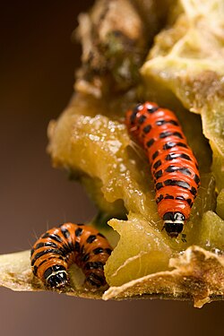 | Larvae of the invasive cactus moth, Cactoblastis cactorum. This pest can attack all species of prickly pear cacti (Opuntia spp.) in North America and can completely destroy a cactus plant. | This image was released by the Agricultural Research Service , the research agency of the United States Department of Agriculture , with the ID D588-2 (next) . | Peggy Greb, USDA ARS | Datei:Cactoblastis cactorum larvae.jpg | |