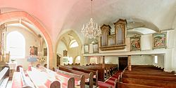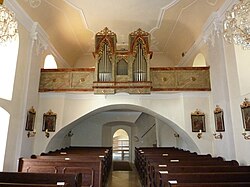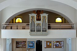 I | 10 | Von Leopold Breinbauer geschaffene Brüstungsorgel auf der Westempore mit dreifeldrigem, neoromanisch- gotisierendem Gehäuse mit einer Figur der hl. Cäcilia auf dem niedrigen Mittelfeld. Sie wird mit einer mechanischen Kegellade bespielt.[16] |
