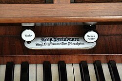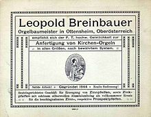| 1878 | Steinakirchen am Forst | Pfarrkirche Steinakirchen am Forst | II/P | 21 | 1878/79 von Josef Breinbauer, nach einem dramatischen Unfall auf der Donau bei Linz, bei dem Orgelteile ins Wasser fielen, geliefert. 1929, anlässlich des 950-jährigen Pfarrjubiläums, baute die Firma Gebrüder Mauracher eine neue Orgel mit etwa 1450 Pfeifen in das Breinbauer-Gehäuse ein.[10][11] | |