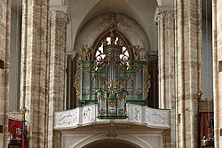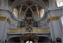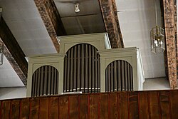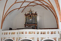 | Blick Richtung Orgelempore in der röm.-kath. Pfarrkirche hl. Valentin der niederösterreichischen Marktgemeinde Großrußbach . Das Orgelgehäuse von Johann Hencke (1743) ist ein zweiteilig gestaffeltes Prospekt mit den Aufsatzfiguren Cäcilia und David und hat ein gleichzeitiges Brüstungspositiv. Das Orgelwerk ist von Philipp Eppel (1961). | Eigenes Werk | C.Stadler/Bwag | Datei:Großrußbach - Kirche, Orgelempore.JPG | |