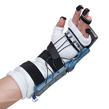 Handorthese zur Nachbehandlung von Beugesehnenverletzungen. Durch Federzüge werden die Finger passiv gebeugt. Eine Freigabe der Beweglichkeit des Handgelenks ist in verschiedenen Radien möglich.