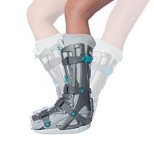 Entlastungsorthesen[48] werden z. B. sowohl bei Degeneration als auch nach Verletzungen von Gelenken eingesetzt. Dazu gehören z. B. Bänderrisse und Verschleiß von Gelenken. Auch nach Operationen, wie einem vollständigen Ersatz eines Gelenkes oder Operationen an der Gelenkstruktur oder anderweitigen Operationen an knöchernen, muskulären Strukturen oder Operationen an den Gelenkbändern werden Entlastungsorthesen eingesetzt.[49][50]