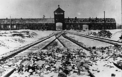 | Es folgt die historische Originalbeschreibung , die das Bundesarchiv aus dokumentarischen Gründen übernommen hat. Diese kann allerdings fehlerhaft, tendenziös, überholt oder politisch extrem sein. KZ Auschwitz, Lagertor Konzentrationslager Auschwitz, Polen 1945. Lagertor (innen) / Ausfahrt nach der Befreiung, im Vordergrund von den Wachmannschaften zurückgelassene Ausrüstungsgegenstände. Auschwitz German Nazi Concentration and Extermination camp (1940-1945). | Dieses Bild wurde im Rahmen einer Kooperation zwischen dem deutschen Bundesarchiv und Wikimedia Deutschland aus dem deutschen Bundesarchiv für Wikimedia Commons zur Verfügung gestellt. Das deutsche Bundesarchiv gewährleistet eine authentische Bildüberlieferung nur durch die Originale (Negative und/oder Positive), bzw. die Digitalisate der Originale im Rahmen des Digitalen Bildarchivs . | Stanisław Mucha | Datei:Bundesarchiv B 285 Bild-04413, KZ Auschwitz, Einfahrt.jpg | |