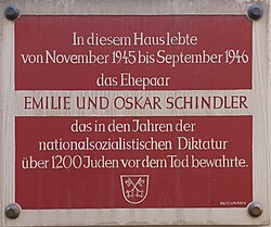 | Bearbeitete Version von durch LSDSL Regensburg (Bayern): Gedenktafel für Oskar Schindler | Eigenes Werk | Peter Bubenik | Datei:300404 regensburg-gedenktafel-oskar-schindler 1-640x480-3.jpg | |
