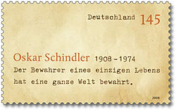 | Gedenkmarke, 100. Geburtstag von Oskar Schindler (1908-1974) | Deutsche Post | Deutsche Bundespost | Datei:Oskar Schindler Briefmarke 2008.jpg | |