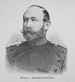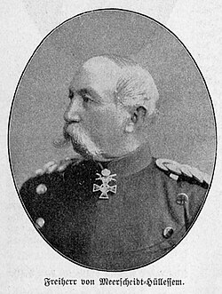 | Oberst de:Gustav Adolf Oskar Wilhelm Freiherr von Meerscheidt-Hüllessem (* 15. Oktober 1825 in Berlin; † 26. Dezember 1895 ebenda) | Krieg und Sieg 1870-71, Herausgeber Julius von Pflugk-Harttung , self scanned | Richard Brend’amour | Datei:Oberst von Meerscheidt-Hüllessem.jpg | |