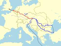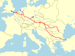 | Route of Oosternde-Wien Express before WW1. Borders are based on the IEG-Maps project . (red) Oosstende - Wien. (blue) 1 : Oostende - Karlsbad Express (1895 - ). 2 : Oostende-Wien-Constanța Express (1895 - 1900), Oostende-Wien Orient Express (1900 - ). 3 : Oostende-Wien-Trieste Express (1895 - 1900). 4 : Oostende-Wien-Orient Express (1900 - ). | Eigenes Werk | Matsukaze | Datei:Oostende-Wien Express 1894.svg | |