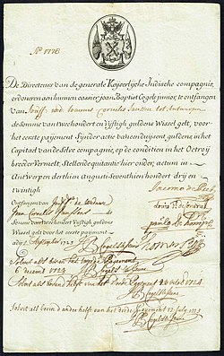 | Coat of arms of Ostend Company printed on and cutted from its share. Copper engraving, 1723. | swaen.com | uploaded by User:Nickpo | Datei:OostendseCompagnie1723.jpg |