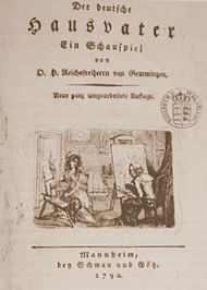 | Titelblatt von Der deutsche Hausvater von Otto Heinrich von Gemmingen-Hornberg , Mannheim, Schwan und Götz 1790 | Photographiert von Castellan | Autor/-in unbekannt Unknown author | Datei:Der Hausvater von Otto Heinrich von Gemmingen-Hornberg.jpg | |