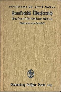 | Front cover of Otto Maull's book Frankreichs Überseereich (French Overseas empire), Volume 1089 of the Goeschen collection | Sammlung Göschen | Verlag Walter de Gruyter Verlag | Datei:Sammlung Göschen Band 1089 Otto Maul Frankreichs Überseereich 001.jpg | |