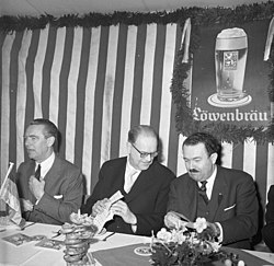 | Es folgt die historische Originalbeschreibung , die das Bundesarchiv aus dokumentarischen Gründen übernommen hat. Diese kann allerdings fehlerhaft, tendenziös, überholt oder politisch extrem sein. Besuch des schwedischen Ministerpräsidenten, Tage Erlander Im Bierzelt München | Dieses Bild wurde im Rahmen einer Kooperation zwischen dem deutschen Bundesarchiv und Wikimedia Deutschland aus dem deutschen Bundesarchiv für Wikimedia Commons zur Verfügung gestellt. Das deutsche Bundesarchiv gewährleistet eine authentische Bildüberlieferung nur durch die Originale (Negative und/oder Positive), bzw. die Digitalisate der Originale im Rahmen des Digitalen Bildarchivs . | Ludwig Wegmann | Datei:Bundesarchiv B 145 Bild-F017607-0011, München, Staatsbesuch Ministerpräsident Schweden.jpg | |