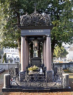 Im Ersten Weltkrieg lehnte es Wagner, der zuvor üppiges Leben gewöhnt war, ab, sich neben den kargen offiziellen Lebensmittelrationen auf dem Schwarzmarkt zusätzliche Nahrung zu beschaffen. Er starb am 11. April 1918 im Alter von 76 Jahren[10] in seiner Wohnung in Wien 7., Döblergasse 4, an Rotlauf. Sein Sterbehaus war nach seinem Entwurf in unmittelbarer Nachbarschaft zum Sitz der Wiener Werkstätte 1912 fertiggestellt worden. Wagner ist auf dem Hietzinger Friedhof in einem ehrenhalber gewidmeten Grab (Gruppe 13, Nummer 131) beigesetzt. Die repräsentative Familiengrabstätte hatte er selbst 1881 anlasslich des Todes seiner Mutter gestaltet. Dorthin wurden sein Vater und der Adoptivvaters seiner Mutter[11] umgebettet. Daher wurde auf die von der Stadt Wien zunächst vorgesehene Beerdigung auf dem Zentralfriedhof verzichtet. Noch im selben Jahr fanden auf diesem Friedhof auch Wagners jüngere Zeitgenossen Gustav Klimt und Koloman Moser ihre letzte Ruhestätte.